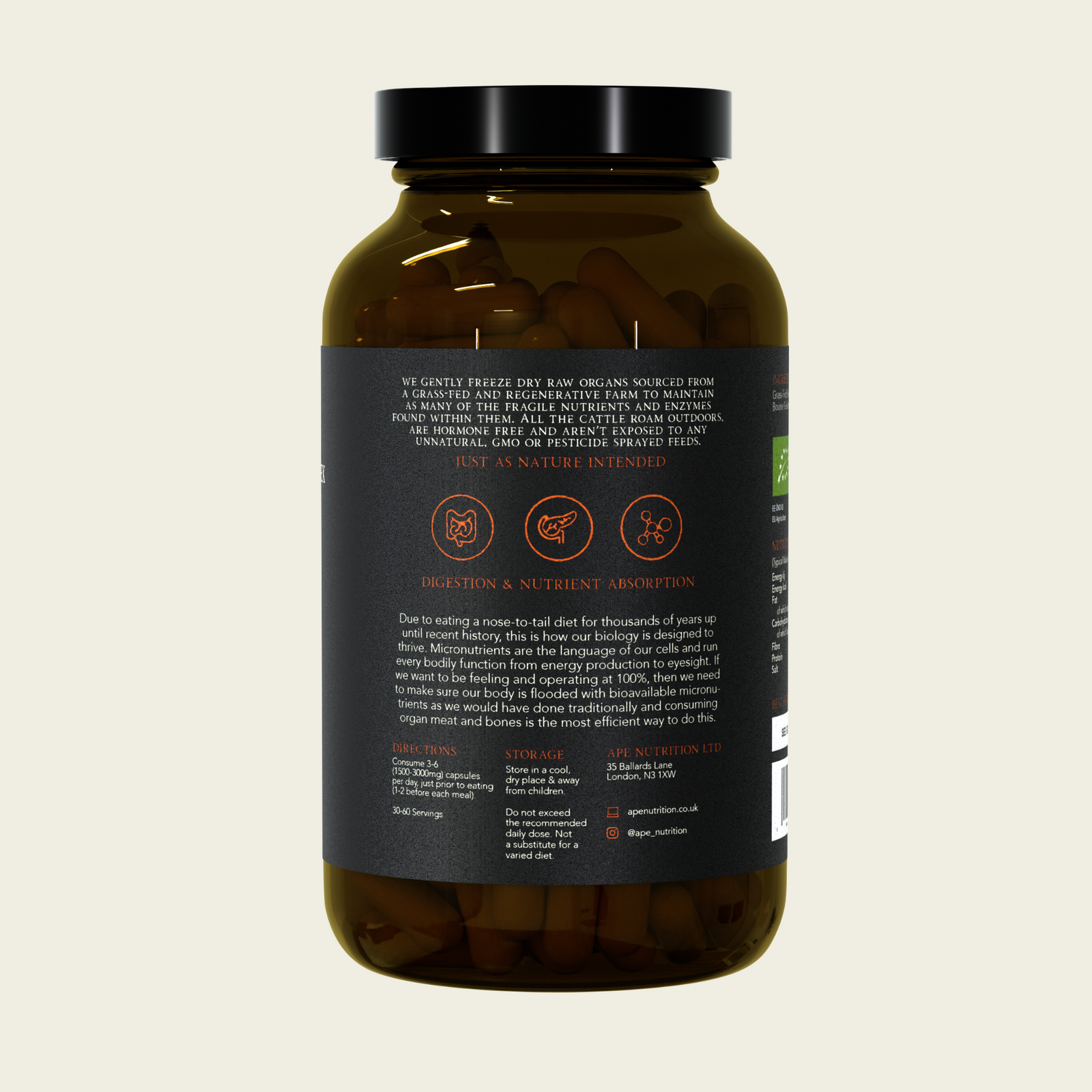 Bone Marrow is the fat held in the centre of animal bones and has a wide variety of health benefits that can support the strengthening cartilage / bones, immunity health, skin health, reducing inflammation and body composition. Rich in collagen, peptides, growth factors, stem cells and a wide variety of micronutrients, it’s one of nature’s superfoods, with research showing it can support your body's production of both red and white blood cells. All the bone marrow we source for our nose-to-tail line comes from regenerative farms where the cattle are 100% grass-fed and free to roam outdoors. We gently freeze dry the marrow raw to maintain as many of the nutrients and stem cells within it. Each jar contains 180, 500mg capsules (30 day supply).
