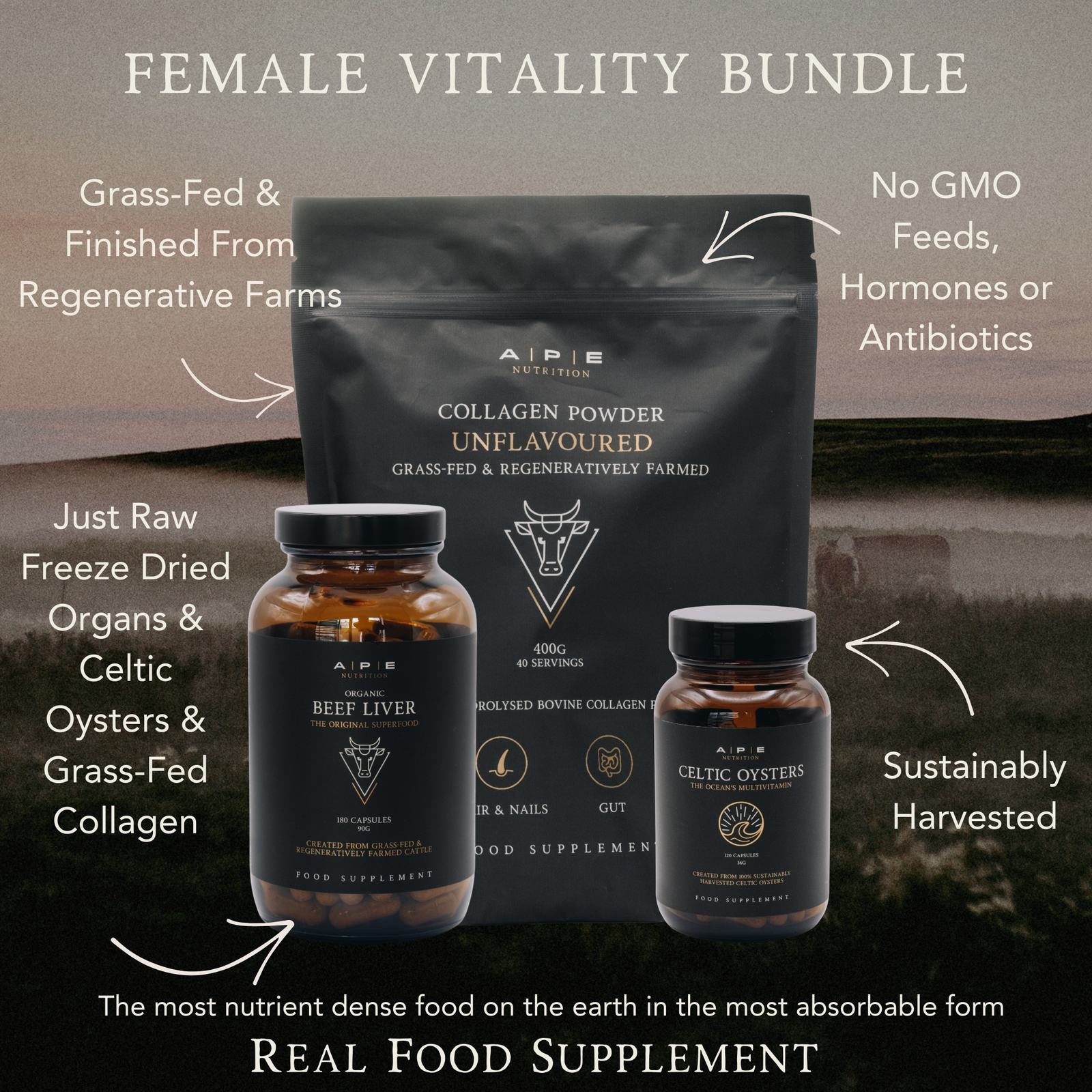 We designed this bundle for women looking to optimise their health and performance through tapping into the ancestral wisdom of culturally traditional foods and the micronutrients within them. Oysters, liver and collagen were three foods treasured by human beings for the majority of our history up until the time of our great grandparents. During WWII both men and women were removed from their homes and our connection with food from the earth started to be lost. Highly processed and nutritionally void convenience foods began replacing what our bodies had evolved and thrived on for every generation prior. The average modern diet sits in stark contrast to what our biology requires and we’re seeing huge rises in chronic diseases as a result. We appreciate there’s no escaping the modern world. However, there is a way to use advancements in technology to reintroduce these ancestrally prised foods back into our diets in a convenient way.