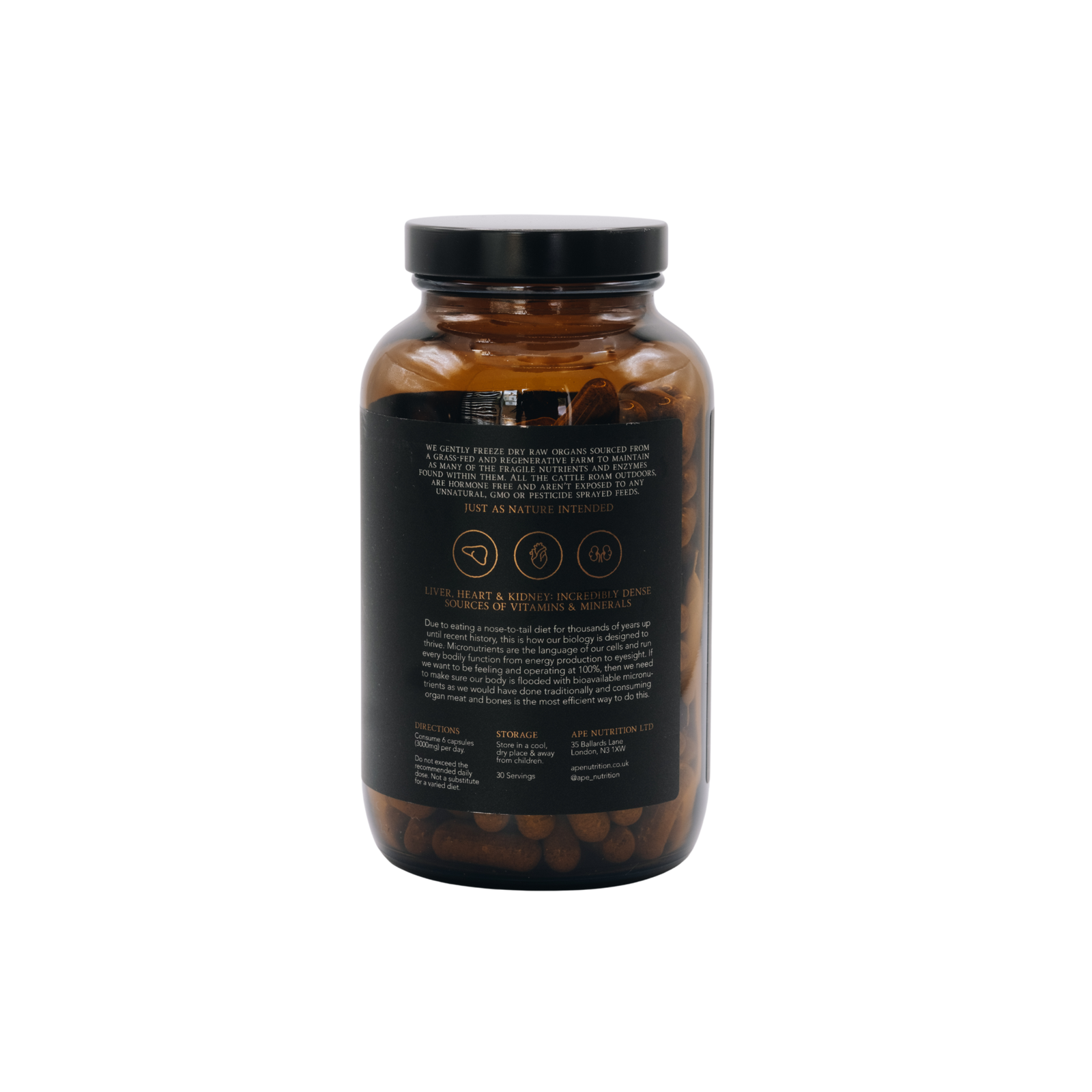 Farming in this way not only gives animals the highest welfare standards and supports the surrounding environment, it also produces the most nutrient-dense meat. We use the cuts that humans have prized throughout evolution — the organs — and carefully freeze-dry them raw before powdering and filling them into bovine gelatine capsules. That’s it. This minimal processing keeps the organs as close to their natural state as possible, preserving their wealth of beneficial nutrients and enzymes.