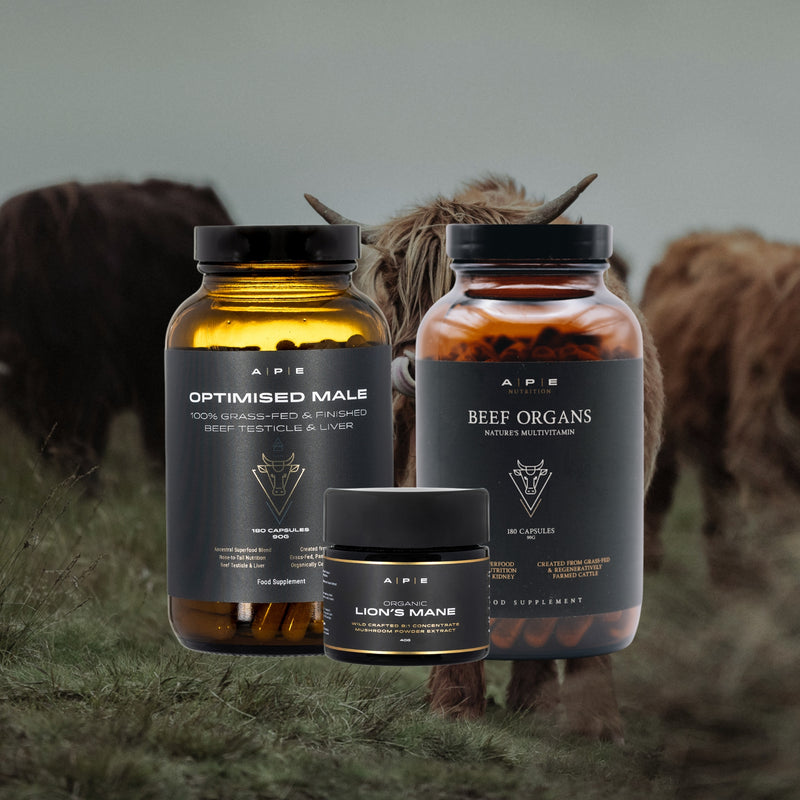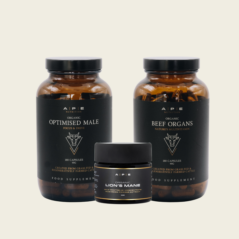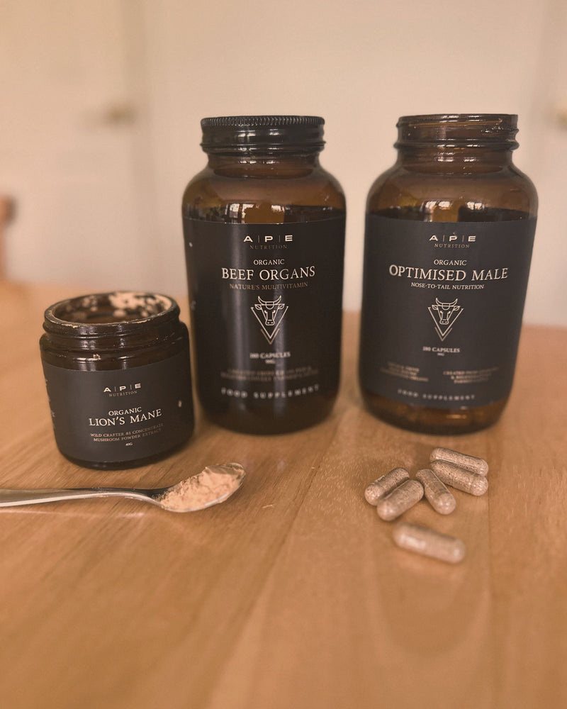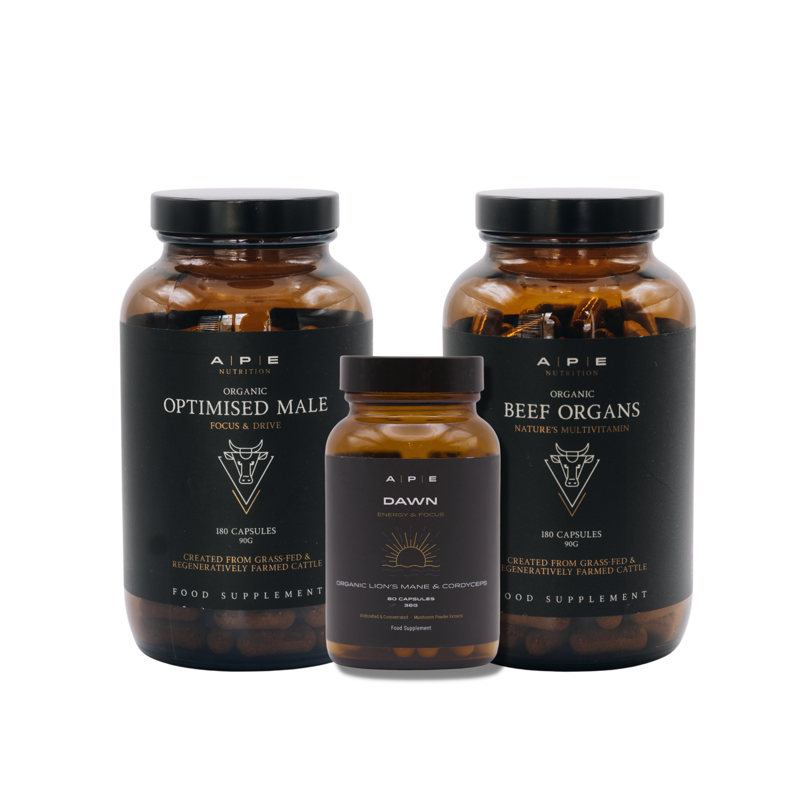 Optimised Male: Consume 6 capsules per day (3000mg of powder, which is equivalent to 15 grams of raw organs), ideally with breakfast or lunch to flood your body with micronutrients for the day ahead.