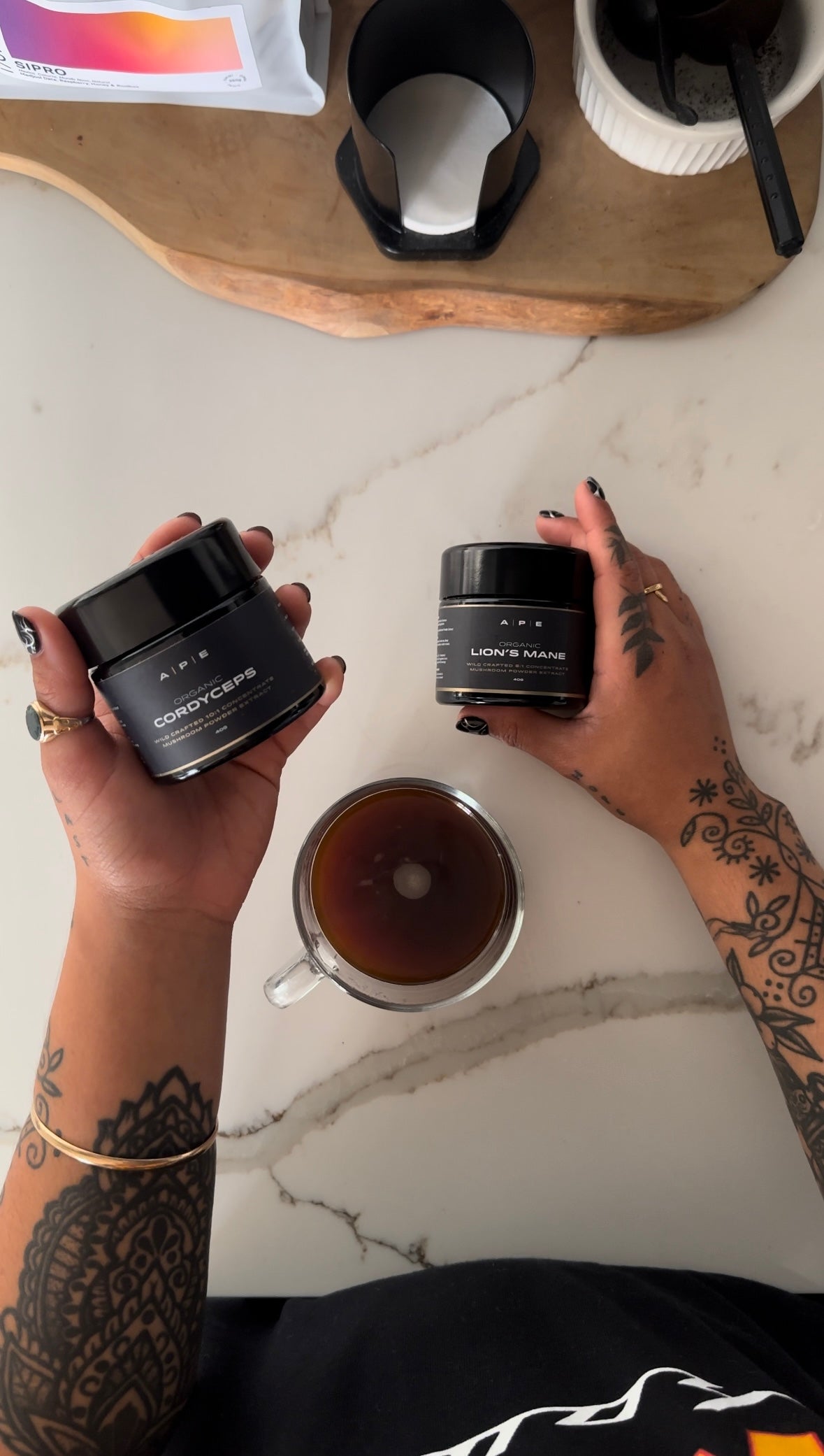 This is one of our favourite product combination here at APE. We blend our organic Lion's Mane, Cordyceps, MCT’s and Grass-Fed Collagen with freshly ground coffee to create that limitless feeling before a big day of work or training. Lion's Mane is known for its ability to support memory and focus. MCT oil provides a clean source of healthy fats derived from 100% sustainably harvested coconuts for energy and gut health. Cordyceps mushroom powder helps to promote oxygen uptake, energy and endurance. Grass-Fed Collagen gives the coffee a creamy consistency whilst supporting your joint health and mobility, skin tone, hair and nail strength as well as gut health. This is our favourite way to set ourselves up for the day.
