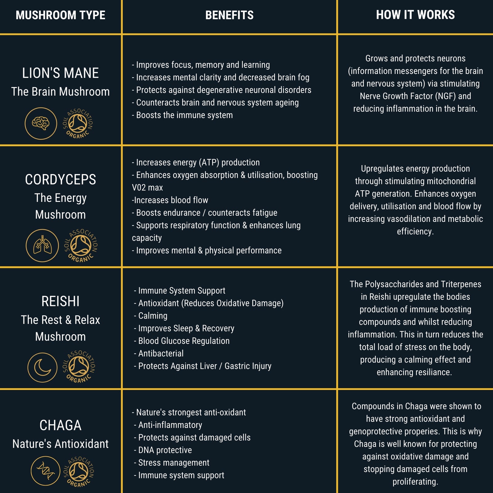All of these mushrooms can offer tremendous benefits to health and exercise performance. Although they share a number of characteristics in terms of supporting mental and physical energy, immunity health and can aid the nervous system, research has shown that each one is a front-runner in its own unique field. Lion's Mane has been known to help support cognition by stimulating nerve cell growth and repair. Whereas Cordyceps may help support the increase of ATP (cellular energy) production and oxygen absorbtion / utilisation. Reishi can help support calming the central nervous system.  All these mushrooms have high levels of bio-active compounds that support the body's immune response and helping the cells ability to eradicate pathogens and increase apoptosis (the clearing our of damaged cells).