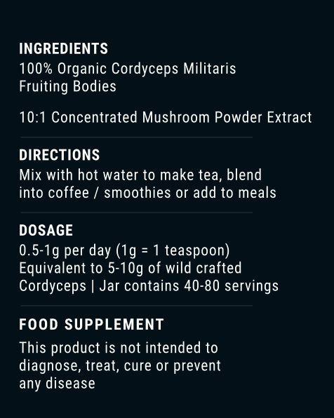 Cordyceps is an edible mushroom that has been shown to have a host of health and performance benefits. Studies have demonstrated its ability to promote oxygen uptake, energy and endurance as well as support immunity focus and blood sugar regulation. This is an 8:1 concentrated extract, which means we use 8 grams of raw Cordyceps to make 1g of powder. All our mushroom powder extracts are naturally wild-crafted, dual extracted and concentrated for maximum levels of beneficial compounds with no heavy metals or toxins.