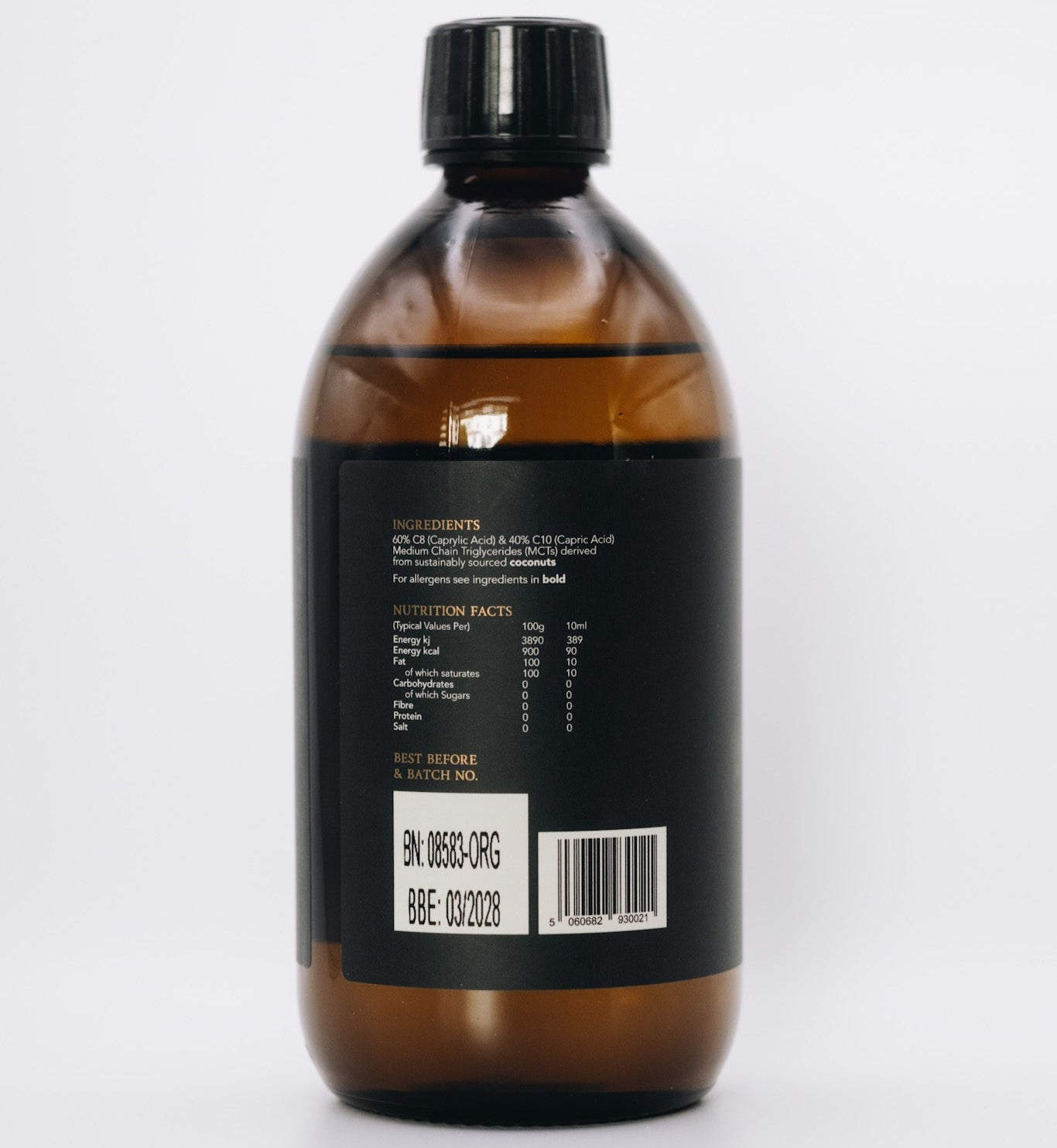 C8 MCTs convert to ketones at a slightly quicker rate than C10 MCTs. However, due to how quickly C8 MCT Oil converts, some people find that taking it in isolation can cause gastric upset. Also, C8 and C10 MCTs have a slightly different micronutrient profile. Therefore we opted for a combination of both to ensure a wider variety of micronutrients and no gastric discomfort when consuming our product.