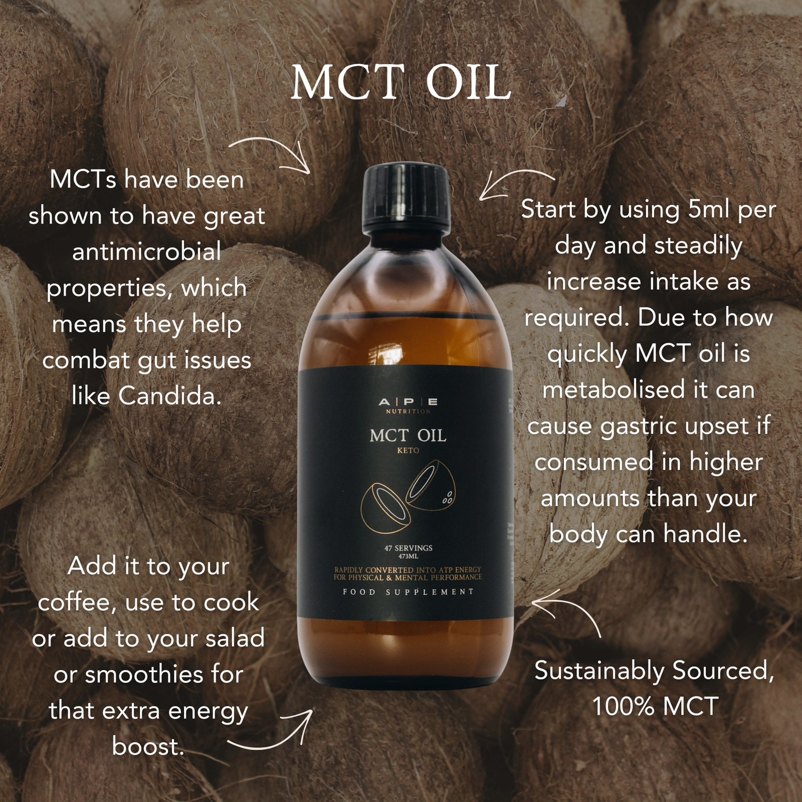 MCT Oil is a real food derived, rapid source of energy. Unlike other fat sources, it doesn’t need to be broken down on consumption, so is either used as an instant source of ATP energy or turned into ketones.