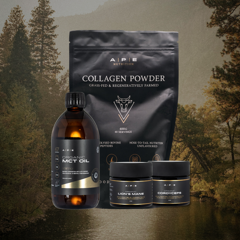 This is one of our favourite product combination here at APE. We blend our organic Lion's Mane, Cordyceps, MCT’s and Grass-Fed Collagen with freshly ground coffee to create that limitless feeling before a big day of work or training. Lion's Mane is known for its ability to support memory and focus. MCT oil provides a clean source of healthy fats derived from 100% sustainably harvested coconuts for energy and gut health. Cordyceps mushroom powder helps to promote oxygen uptake, energy and endurance. Grass-Fed Collagen gives the coffee a creamy consistency whilst supporting your joint health and mobility, skin tone, hair and nail strength as well as gut health. This is our favourite way to set ourselves up for the day.